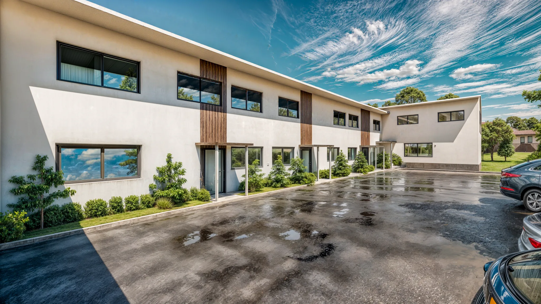 This image captures a clean-lined residential complex framed by lush greenery and soft reflections of the sky after rainfall. The modern façade, characterized by sharp contrasts of white and neutral tones, integrates seamlessly with nature, while landscaped shrubs along the walkway soften the geometry with organic textures. The puddles scattered across the pavement bring an atmospheric quality, suggesting freshness and life after the rain.