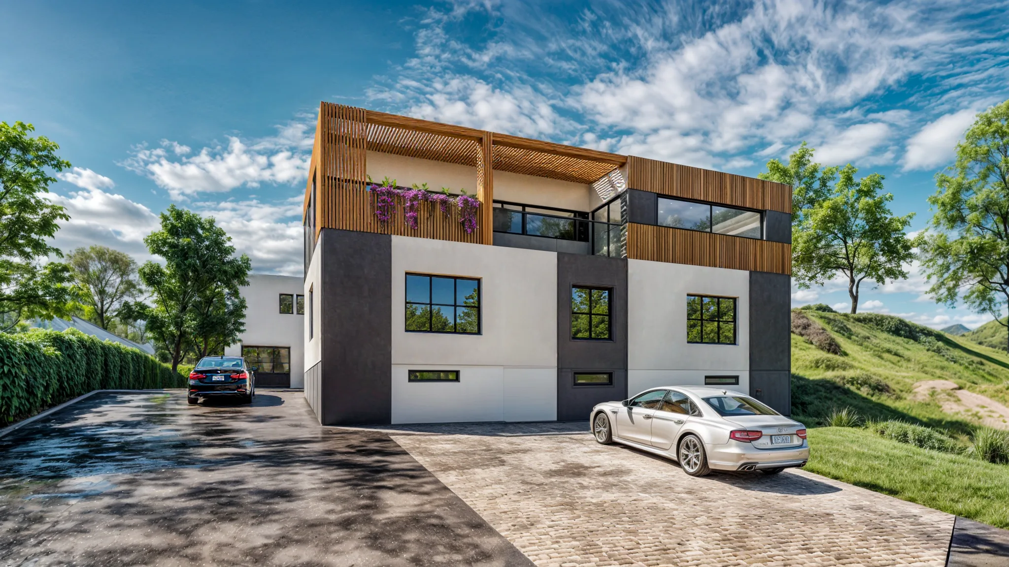 Set against rolling green hills and framed by mature trees, the building feels both private and connected to its environment. The cobblestone driveway and sleek modern cars emphasize exclusivity, positioning this residence as a perfect blend of modern architecture, refined living, and natural tranquility. It communicates an elevated lifestyle, where design and comfort coexist seamlessly.
